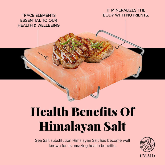 UMAID Himalayan Salt Block For Grilling, Cooking, Cutting and Serving,8X8X1.5 Food Grade Himalayan Pink Salt Stone on Stainless Steel Plate & Recipe Pamphlet, Unique Gifts for Men, Women, Chef, Cooks