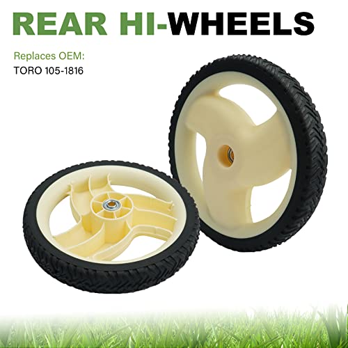Details: Always Manufactured To OEM Specifications - 12" Rear Wheel Replaces OEM: TORO 105-1816 Specs: Tire Size: 12", Hub: 1 3/4", Bore: 1/2"; Tread: Radial Fit Models: Toro 22" Recycler, 20012, 20016, 2002-2005, and 20019 20012 (220000001-220300000)(2002) Lawn Mower 20012 (220300001-220999999)(2002) Lawn Mower 20012 (230000001-230999999)(2003) Lawn Mower 20012 (240000001-240999999)(2004) Lawn Mower 20012 (250000001-250999999)(2005) Lawn Mower 20016 (220000001-220300000)(2002) Lawn Mower 20016 (220300001-220999999)(2002) Lawn Mower 20016 (230000001-230999999)(2003) Lawn Mower 20016 (240000001-240999999)(2004) Lawn Mower 20016 (250000001-250999999)(2005) Lawn Mower 20019 (230000001-230999999)(2003) Lawn Mower Package: Wheel X 2