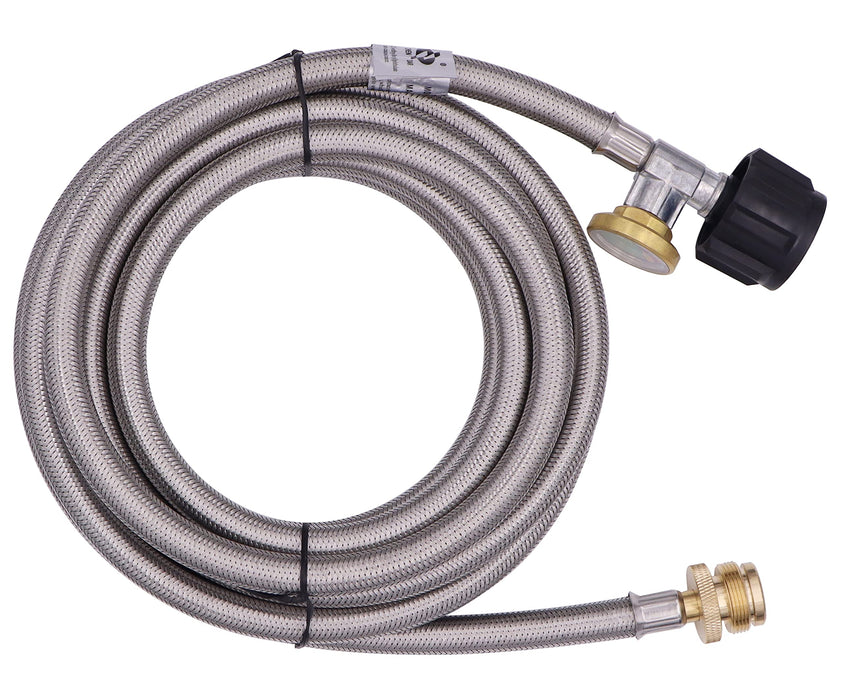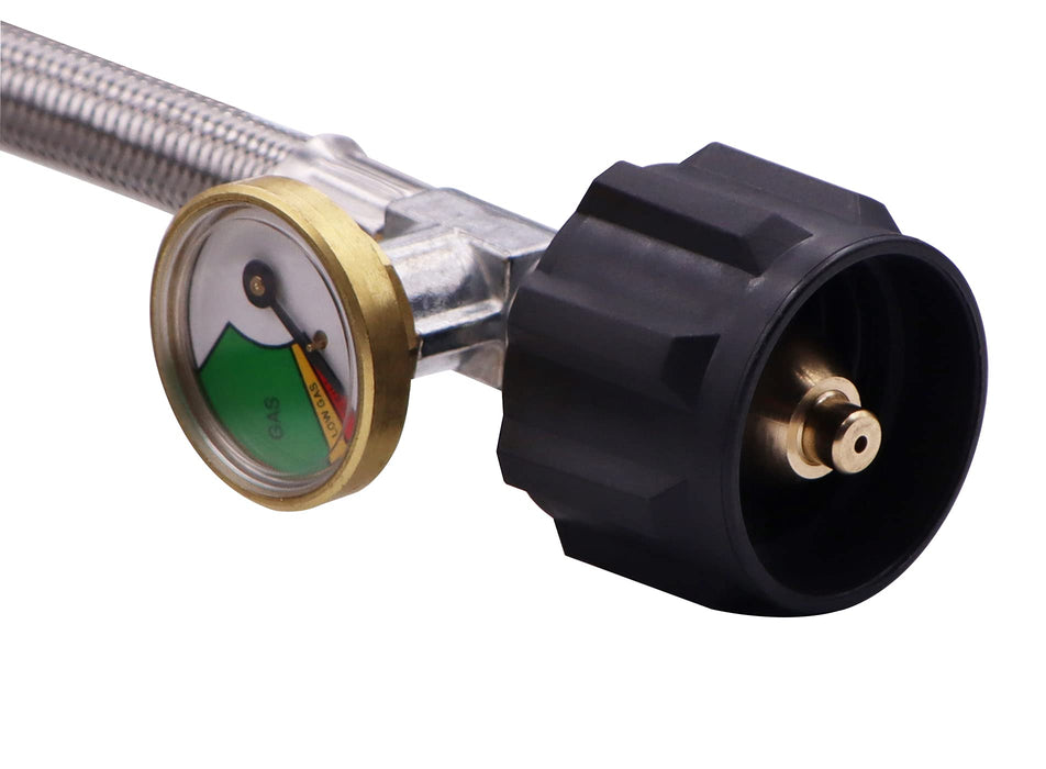 Details: 【Stainless Steel Braided Hose】: 15 FT Propane stove hose made of stainless steel braided with good anti corrosion & heat-resistance,stronger bending and more durable, also avoid dog bite. 【Over Flow Protection Device】: Inside built with safety device when somewhere with gas leakage and the black adaptor will shut off gas directly and no propane will come to the grill.This High Pressure Hose uses highest quality rubber to ensure you safe leakage free operation while providing excellent weather resistance, Safe and made of quality material.MAX 350 PSI 【 Safe Operation】: Propane converter hose with gauge is CSA certificate to ensure air tightness and stability. 1lb Male throwaway cylinder thread CGA600 Outlet x Nut (QCC1). 【 Compitable】This 15ft stainless braided propane hose with new meter gauge which can monitor the exact propane in different weather condition which is more accurate then old one, is used to hook 1lb portable appliance to 5-40lb LP tank. Not only 1lb tank any more.CONNECT 1 Pound PORTABLE APPLIANCE TO 5-40 Pound PROPANE TANK - Hose with adaptor fitting let you hook your 1lb propane required propane appliance with 5-40 lb tank or lager by connecting this adaptor, Allows connection to more fuel 【Widely Use】: This propane tank hose adapter 1lb to 20lb is easily connects small appliance. Widely used in outdoor propane appliances like propane stove, tabletop grill and more 1lb portable appliance. Perfect for lantern, buddy heater, camp stove, portable grill, tabletop grill, and more. Great for camping, tailgating, heating needs or having an outdoor cookout.