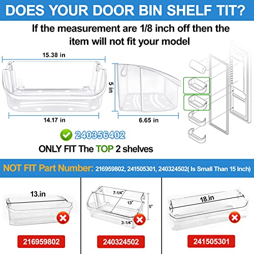 - 【240356402 Refrigerator Door Bin--ONLY FIT Top 2 shelves】This Clear 240356402 frigidaire door shelf replacement parts number: 240356402, AP2549958, 240430312, 240356416, 240356407, 240356408, 240356410, 240356411, 240356413, 240356414, 240356415, 240430305, 891214, AH430122, EA430122, PS430122, 241808205. If you are not sure whether the 240356402 door bin frigidaire shelf replacement shelves fits your frigidaire refrigerator, please feel free to contact us,we can confirm it for you.