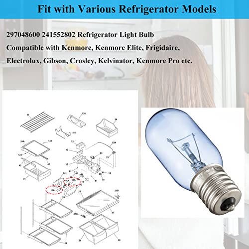 - 【Compatible】 297048600 241552802 Refrigerator Light Bulb compatible with Frigidaire, Kenmore, Kenmore Elite, Electrolux, Gibson, Crosley, Kelvinator, Kenmore Pro etc refrigerators. Fit for 25377969801 25374979703 25369254701 25374225701 25374225703 25376889504 GLRT217TDBP PHT219HSM3 GLRT86TESA GLRT217TDB1 etc model refrigerators. More Models have query, please contact with us freely.