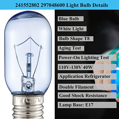 - 【Easy Install & Cost-Effective】 241552802 297048600 refrigerator light bulb is very easy to install. You just need couple of minutes to screw in a new light bulb, you can also used it on reading light, gallery, desk lamp and daily lighting If the outer diameter of the thread is suitable for your socket.