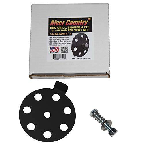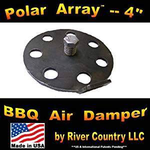 Details: Welcome to the New “Polar Array” Barbecue Grill, Smoker, and Pit Air Vent Control Damper by River Country. The Polar Array is by far one of the easiest to install and use barbecue grill, smoker or pit air damper vent system on the market. The patented design allows for easy installation using only a 3/8” and a 1/2” drill bit. No more trying to cut of triangles or large circles using a saw. The Polar Array features a unique compression spring mounting system for secure mounting and easy adjustment of the air flow. The Array’s works great for adjusting either air intake or air/smoke exhaust or can be installed in sets to control both. The Polar Array is made from heavy duty 1/8” thick steel to withstand years of use and can be painted to match your grill, smoker or pit. The Arrays are manufactured with all American made parts and are assembled right in our warehouse in the heart of the Minnesota Iron Ore Country. The Polar Array’s are available is two versions, 4” and 6”. The 4” Array is a 4” diameter flat plate with 7—1/2” Vents and is perfect for smaller backyard kettle type grills. The 6” Array is a 6” diameter flat plate with 12—1/2” Vents and is ideal for larger barrel grills and smokers. Complete mounting instructions and hardware is included. Standard Features: River Country patented Circle Air Design Easy to drill 3/8” center mount and 1/2” Array Vent Holes Compression spring mounting for easy air flow adjustment Works great for both intake or exhaust air flow Easily paint to match you grill, smoker or pit Proudly made in USA 4” Polar Array Features: 4” Diameter flat steel with 7—1/2” Vent Holes