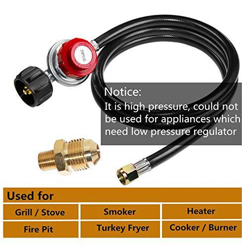 - Adjustable 0-20 PSI high pressure output propane regulator with 5 feet hose is a must have item for your propane burners, stove, turkey fryers, heaters, smokers. Not suitable for appliances which need low pressure regulator.