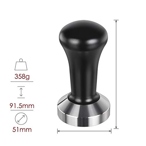 Details: Stainless Steel Tamper bySANTOW In order for the portafilter to develop sufficient pressure and to prevent the water from penetrating too quickly, the coffee grounds need to be properly compressed with a coffee tamper. Noted: Please Keep the Stainless Steel Base dry after use. RRODUCT INFORMATION: Material: Stainless Steel and Aluminum Base diameter: 51mm Height: 91.5mm Weight: about 358g