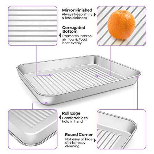 Details: P&P CHEF Stainless Steel 9 Inch Toaster Oven Pan with Cooling Rack Pack of 2, which is made of high quality stainless steel without any harmful materials, is non-toxic for your daily baking use. The mirror finished and corrugated surface make it less sticky to food for easy cleaning. The mesh rack can keep your food from falling down, and it is designed to fit perfectly inside the baking sheet. They created different usages such as single use or combined use. This set could meet your multiple needs, like baking, roasting, and cooling, cooking and serving. Both the pan and rack is dishwasher safe to save your labor and time. WHAT INCLUDED 9 x 7 x 1-inch Tray X 1 Pc 8.75 x 6.25 x 0.75-inch Rack X 1 Pc SPECIFICATION Material: pure stainless steel Color: Natural Metal Silver Craft: Mirror Finish, Roll Edges, Deep Rim, Grid Wire, Corrugated Surface Features: Non toxic, Easy Clean, Heavy duty, Dishwasher safe WHY YOU CHOSE STAINLESS STEEL BAKING PAN 1. Stainless steel baking pan is non teflon coating and non toxic than aluminum 2. Stainless steel baking pan is dishwasher safe but aluminum not, Easy clean even by hand-wash 3. Stainless steel baking pan has natural shining surface and corrugated base, less sticking to food 4. Stainless steel baking pan cooks food more evenly, Deep full sides to hold more food USING INSTRUCTION 1.Please wash the set with soapy water before first using to wash off any residue left. 2.Please use soft dishcloth to clean the set for the beauty of its smooth surface. 3.Please clean and dry the set after using, Stored in dry place for its durability. TIP for STICKLESS You can use a light spray or grease the pan with a little oil or butter to avoid food sticking.