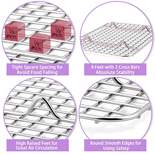 - 【FRIENDLY DESIGNS】Both cookie sheet and grill rack are finished by the mirror polish, Always keep a shiny surface and look like the new, Come with smooth edges and no rough spots, To protect your hand roundly and bring you a comfortable grip, The mesh rack have 6 raised feet to lift food up for a great air circulation, 1 inch side of the pan can contain more food and sauces to make big meals