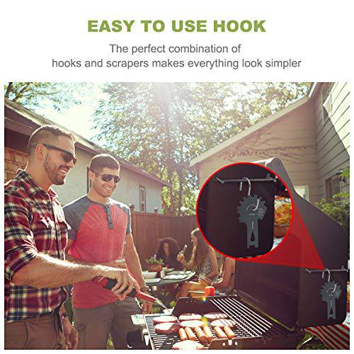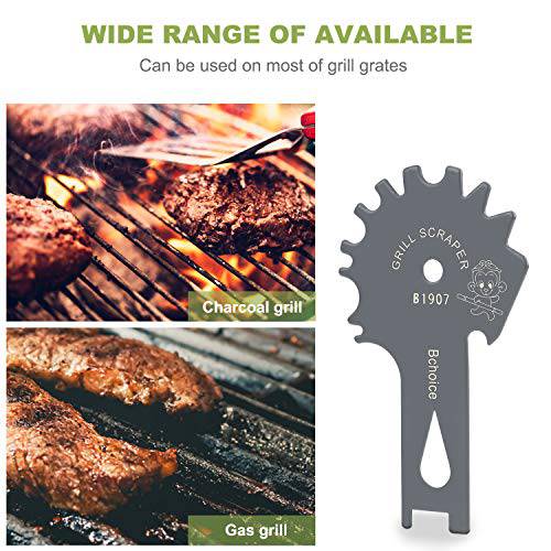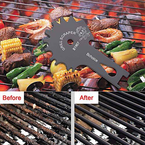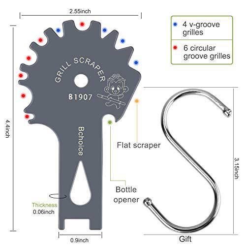 Details: This BBQ Cleaner works with most grills and is a safe, effective way to prep your grill for your next barbecue. Filthy grill grates can lead to foul-tasting and potentially contaminated food. But WIRE BRUSHES OFTEN SHED THEIR BRISTLES, which can then wind up in your meat. So what's the solution? It's the Grate Grill Scraper by Bchoice. This grill cleaning tool WORKS WITH MOST OF GRILLS, featuring 5 notches for round grates, 5 notches for V-shaped grates, fits barbecue grills in most state and national parks and campgrounds. Just a few quick passes over your grate removes built up grease, charred meat and other debris, leaving a smooth and clean surface. FEATURES 1 Compatible with Round, V-shaped and Square Grates 2 Safer than Typical Wire Brushes 3 Durable 304 stainless steel 4 Small Size That Easy to Carry SPECIFICATION Item Dimension: 4.4 " x 2.56" Thickness: 0.06 inches Net Weight: 1.48OZ/42g Package Size: 3.3" x 5.3" x 0.67" Package include: A Grill Scraper+A "S”Hook