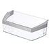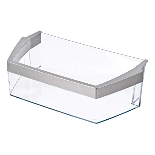 - High quality Bosch OEM 00677095 Refrigerator Door Lower Bin is clear with a gray top edge