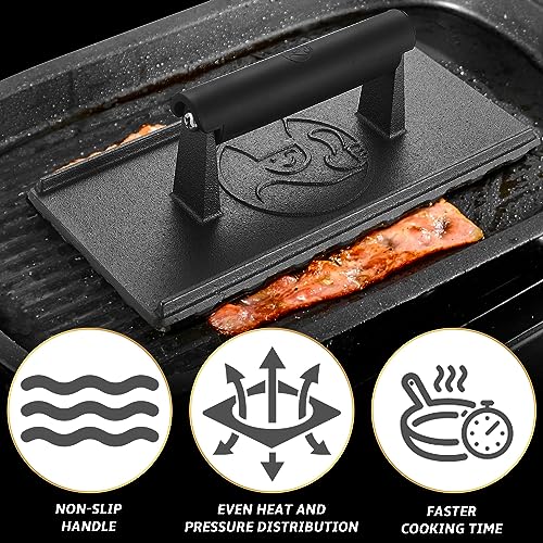 - EYE-CATCHING GRILL MARKS: Bring a smile to everyone who enjoys the sound of sizzling meat when searing their meal using our bacon press for griddle. Perfect for creating beautiful-looking grill marks on steaks, chicken, panini, bacon, and patty. Try this amazing cooking gadgets now!