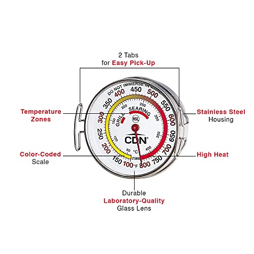 Details: The new NSF certified CDN ProAccurate grill surface thermometer (GTS800X) gives grilling enthusiasts the advantage of knowing the exact temperature of their grilling surface. It sits directly on any cooking surface, from the rack of a grill to a frying pan or griddle, and it features a helpful Color- coded scale that highlights target temperatures for grilling and searing perfection. The ProAccurate grill surface thermometer provides accurate measurements in 10-degree increments between 100 and 800-degreef (40 and 425-degreec), making it ideal for grilling lamb, chicken, beef, shrimp, vegetables and other favorites. Constructed for durability, it features a sturdy laboratory glass lens that can withstand high heat, and a large, shatterproof, easy-to-read dial. The ProAccurate grill surface thermometer features a large display that is 2.25 inches (5.7 cm) diameter for easy reading, even in low light. The dial is framed by sturdy 430 stainless steel housing, for durability through the years. Designed for safe and convenient transport even when hot, the ProAccurate grill thermometer features two tabs on the top that can be used to lift and move the unit. Another option is to use a spatula to lift the thermometer from the bottom.
