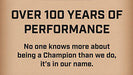 Details: Champion delivers the dependable performance you can trust. This Champion small engine spark plug with a copper core electrode provides increased conductivity and heat control for superior overall wear. It is compatible with Passenger Cars, Powersports, Lawn and Garden, Snow and Marine applications. The iconic Champion brand has been a world leader in the manufacture of spark plugs for every kind of combustion engine for over 100 years. As a powerful symbol of performance driven quality, this experience and commitment has led to design enhancements that optimize the performance of every spark plug Champion makes. Champion understands the importance of OE fit and form replacement parts and knows that these parts adhere to the industry’s toughest standards — and to yours. Step-by-Step Instructions for Installing a Champion Spark Plug Step 1 If necessary, set the gap on the new spark plug before installing it. In the past, it was necessary to use a gapping tool to make sure the gap in the spark plugs was the correct size. Today, Champion spark plugs come pre gapped, eliminating the need for this step most times. You should double check that the gap is correctly set; check your owner’s manual to find the distance for the spark plug gap and use a gap gauge or feeler gauge to check the distance. Step 2 Seat the new spark plug by hand; turning it clockwise at least two full turns. Once you have the spark plug snug, use the socket wrench with extension and spark plug socket to tighten it turning the plug clockwise. The plug’s washer should be pressed against the mounting surface. Take care not to over tighten the plug; you can strip the thread on the head of the engine leading to costly repairs. You can also use a torque wrench to torque it to specification (OE service or repair manual). Step 3 Replace the spark plug wire boot or ignition coil and wiring connector. A plastic boot should click into place while a rubber boot may require a coat of dielectric grease on the inside of the boot for easy removal next time. Step 4 Repeat the removal and installation process for each spark plug. That’s all there is to it! If at any point you run into issues or have a question, consult your mechanic. These instructions are for informational purposes only and should not be used in lieu of seeking professional advice from a certified technician. We encourage you to consult with a certified technician if you have specific questions or concerns relating to any of the topics covered herein.