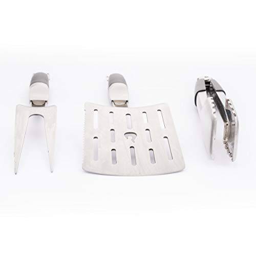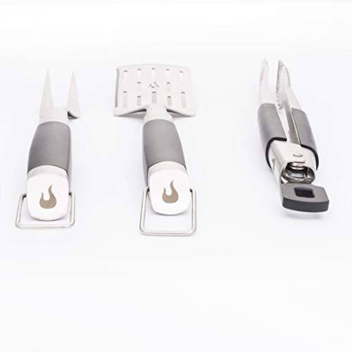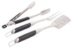 Details: The Char-Broil Medallion tool set is a 3-piece grilling tool set consisting of a spatula, locking tongs and fork. Features heavy-gauge, stainless steel construction which won't bend or break, along with rubberized handles for smooth, easy gripping. All three tools feature a ring at the end of the handle from which they can be hung, and classic Char-Broil logo.