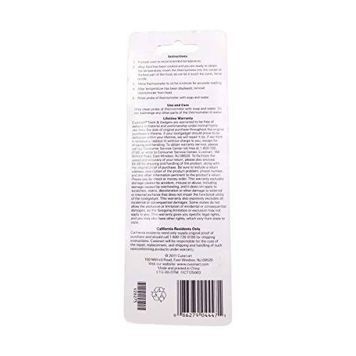 Details: Cuisinart's meat thermometers elevate home cooking to a science by taking the guesswork out of cooking. Ideal for poultry and roasts, the digital meat thermometer features a large, easy-to-read LCD digital display. The thermometer also makes cooking easy by displaying Fahrenheit and Celsius temperatures -- from -40 degrees Fahrenheit to 450 degrees Fahrenheit; from -40 degrees Celsius to 232 degrees Celsius. Features: Easy-to-read digital LCD|Oven safe to 450˚F|Durable stainless steel probe|Probe cover and AAA battery included