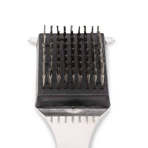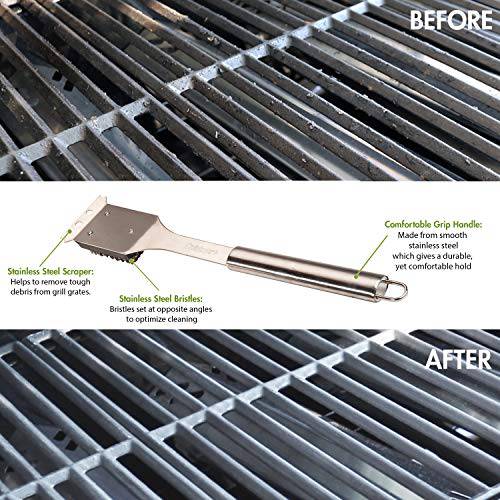 - STAINLESS BRUSH AND SCRAPER: The brush is made from stainless steel, meaning it won’t rust or deteriorate, and also features a stainless steel scraper at the end of the brush to help remove tough debris from the grates.