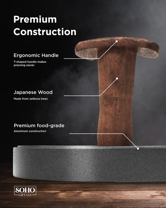 - Made with an ergonomic solid wood handle and premium non-stick aluminum. (Diameter: 4.7" / Hand wash only)