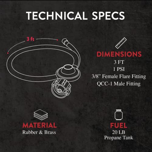 Details: Specifications: Product length: 3'. (91. 4 cm)product weight: 14 oz. inlet: 3/8” flare fitting male QCC (acme)outlet: 5/8” – 18 UNF pressure: low pressure 1PSI description: - Made to last with high quality materials>- simple installation with no tools required - Made to fit QCC-type-1 connections - used for a variety of propane gas appliances