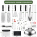 - 【Perfect 43pcs BBQ Accessories】This griddle accessories kit includes: 1* long griddle spatula, 1* slotted spatula, 1* slant edge scraper, 1* slotted turner, 1* fork, 1* grill tongs, 8* kabob skewers, 1* sauce brush, 1* chopper, 4* corn holders, 2* squeeze bottles, 4* egg rings, 10* hanging hooks, 1* meat injector, 1* meat knife, 1* basting cover, 2* spice shakers, 1* cleaning brush, 1* storage bag.