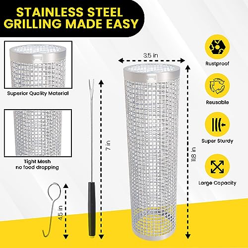 Details: Redefining the Pleasure of Barbecue: Grilling will no longer involve just cooking; it will mean sharing an experience. A new and enjoyable way to have a barbecue with the NovaDesign Grill Basket is waiting for you. Trigger Your Creativity: Put vegetables, meat or any flavor in it, close the lid and get ready for an exquisite barbecue feast. Thanks to the fork provided on the side, you can effortlessly turn over your delicious grilling basket at any time. Durability and Aesthetics Together: The NovaDesign vegetable grill basket is made of 1 mm of high-quality 304 stainless steel. The use of quality materials gives the product a heavy and solid feel. Large Cooking Area: Whether you decide to organize a delightful family barbecue or host a private barbecue party for your friends, its dimensions of 11.8 x 3.5 x 3.5 inches offer ample cooking space to keep everyone satisfied. Easy Cleaning, Pleasant Care: You can restore the product to the state it was on the first day by putting it in the dishwasher or washing it by hand. Package Includes: Round Grill Basket Small Hook Small Fork ⚠ Attention: There may be very few traces on the welding parts of the product (impact marks); however, these will have no effect on the robustness or functionality of the product. Only minor visual defects may occur. ⚠ Safe Use: Avoid direct contact with high temperatures on the barbecue. If direct contact is required, be sure to use heat-resistant gloves. Take your barbecue pleasure to the next level with the NovaDesign Grill Basket. Step into a world full of delicacies!