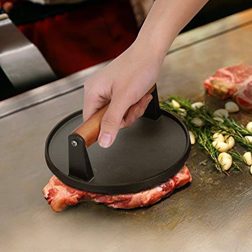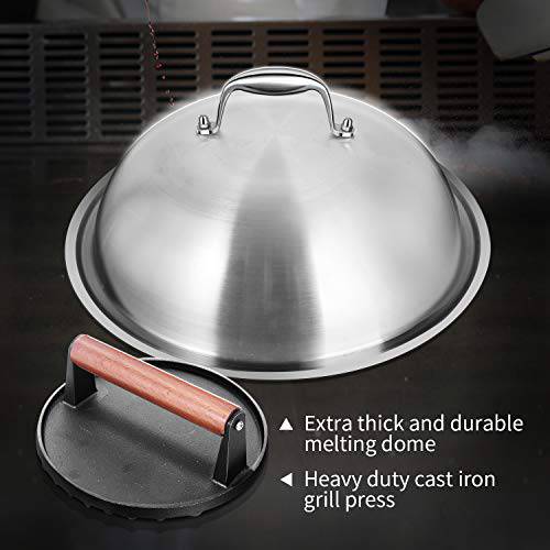 • [TOP QUALITY AND SUPERIOR MATERIAL] The dome is 2.5mm thick 304 stainless steel and heavy duty, It’s durable and easy to clean. The press is made with heavy-duty cast iron and the heat resistant wooden handle is solidly installed. Both of griddle tools are perfect for longer use.