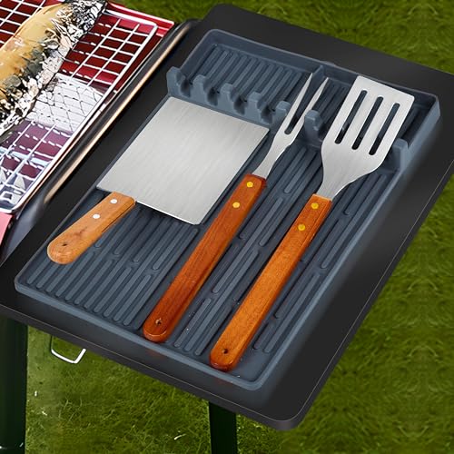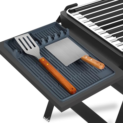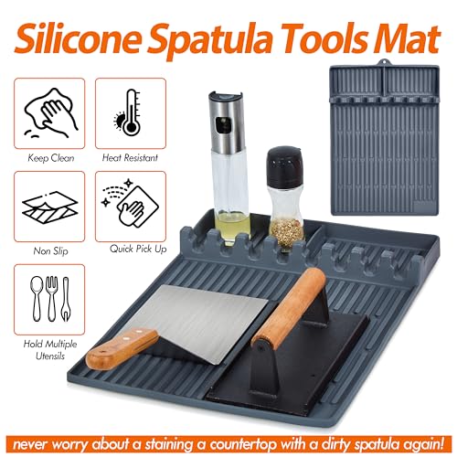 - 【Best Gift Choice】- This silicone spatula mat can use for holder spoons, spatulas, ladles, brushes, tongs, or forks, also can use for holder grill BBQ caddy seasoning jars. They are great for kitchen, cooking and countertop to keep clean. Never worry about a staining a countertop with a dirty spatula again! It is best gift choice for Grill BBQ accessories. This silicone grill tools mat is pefect for Blackstone side shelf.