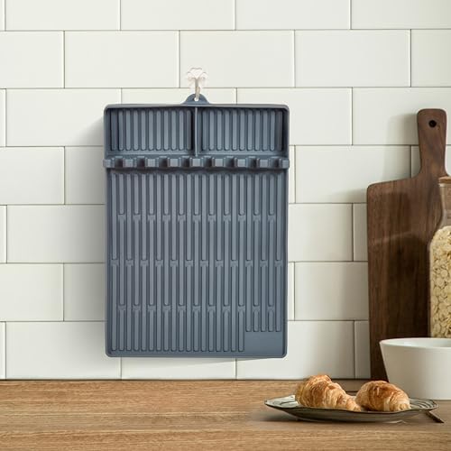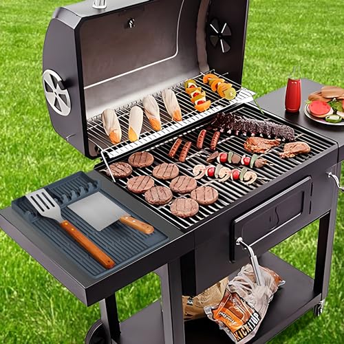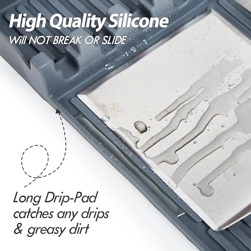 - 【Large Size 16x11.5" Silicone Spatula Mat】- Package Include 1pc large size 16x11.5" silicone spatula mat with drip pad. This practical silicone griddle tools mat for Blackstone side shelf can use for grill BBQ caddy seasoning jars holder and ladle spoon multiple utensils holder. Suitable for kitchen, cooking and countertop to keep clean. Never worry about a staining a countertop with a dirty spatula again!