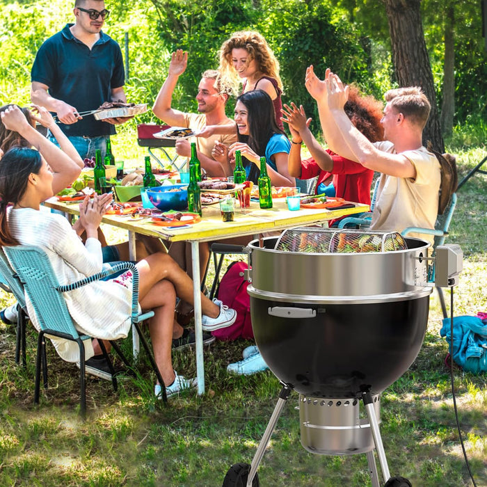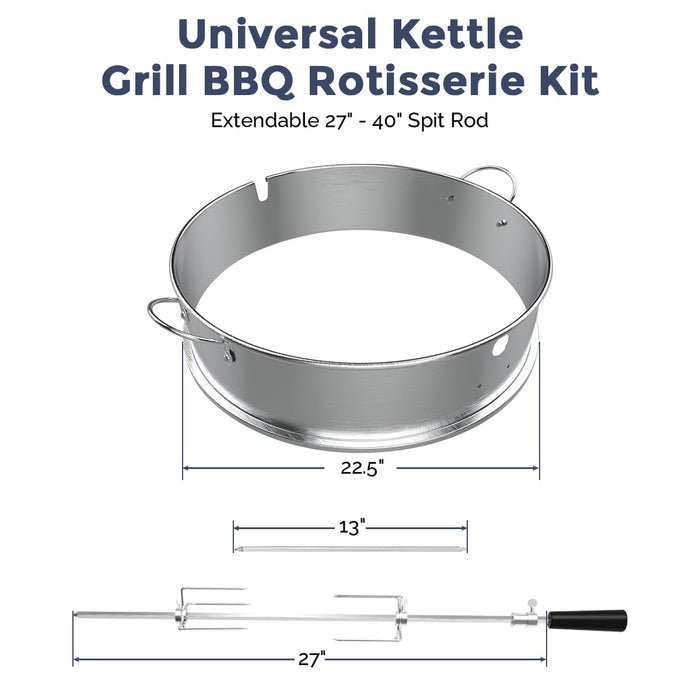IULULU BBQ Rotisserie 22.5-Inch Kettle-Stainless Steel Grill Rotisseriee Ring Kits for Weber CharcoalGrills with Motor, Forks, Extendable Spit Rod (27"-40"), Silver