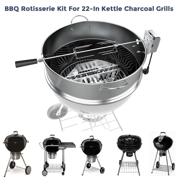 - 【Wide Compatibility】The rotisserie Kit for 22-Inch Weber charcoal kettle grills, compatible with Weber rotisserie 2290. It is also fit for other similar 22-Inch Kettle Charcoal grills. ★NOTE: NOT FIT Weber Smokey Mountain Cooker.