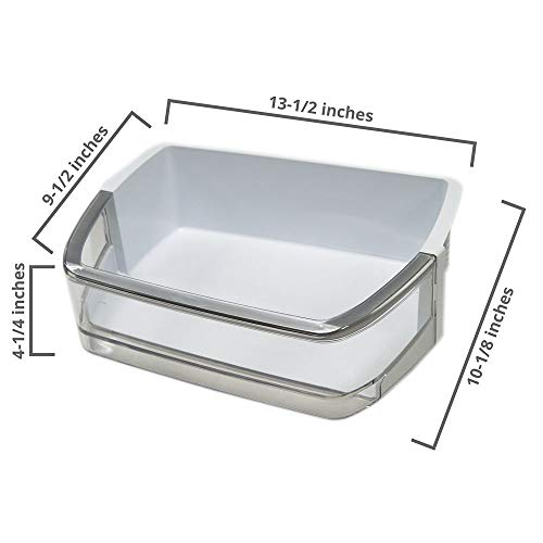 • This door bin has an irregular shape; it's 13-1/2 inches wide, 9-1/2 inches deep on the left, 10-1/8 inches deep on the right and 4-1/4 inches tall