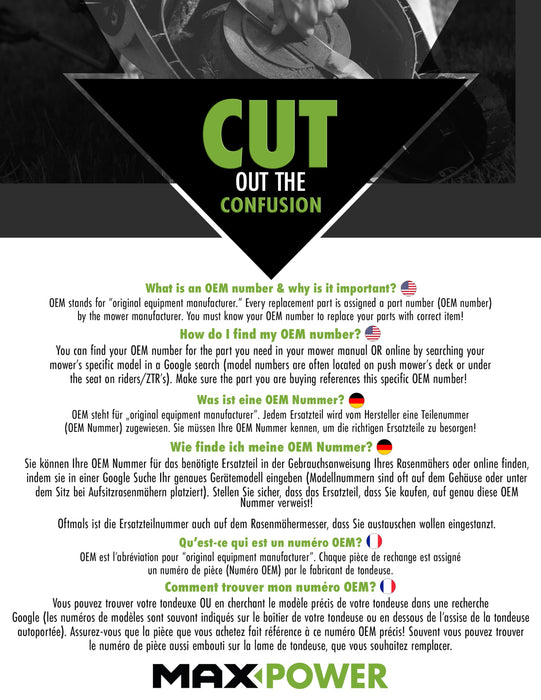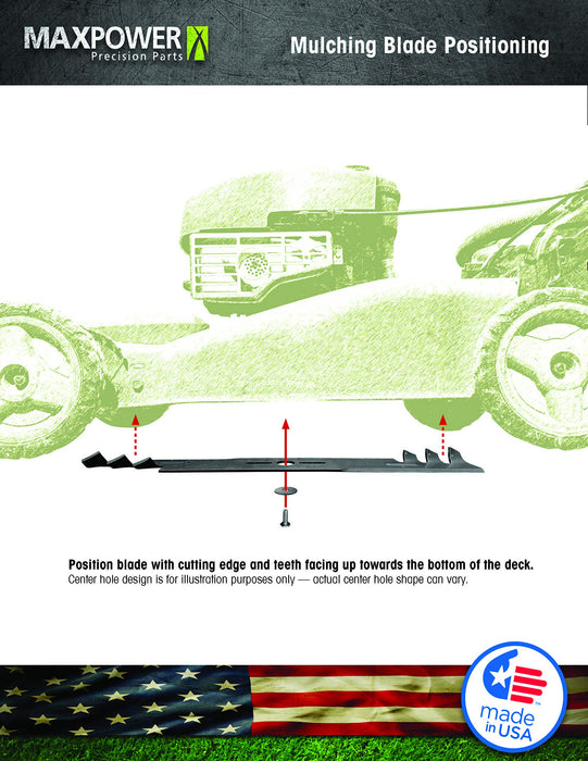 Details: MaxPower's 331749XB commercial mulching blade for a 22" Cut Craftsman/Husqvarna/Poulan replaces 580-244001, 580-244002, 580244001, and 580244002. This blade measures 21-15/16" x 2-1/2" with a 5 point star center hole. Commercial mulching blades feature greater cutting surface for increased mulching performance, sharpened cutting teeth for a precision cut, and a centrifugal air lift design for uniform chopping distribution. Features an extra paint coating designed to protect from personal injury during handling that disappears when the blade is engaged leaving a sharp mulching edge. MaxPower blades are proudly manufactured in the USA to meet or exceed OEM specifications.