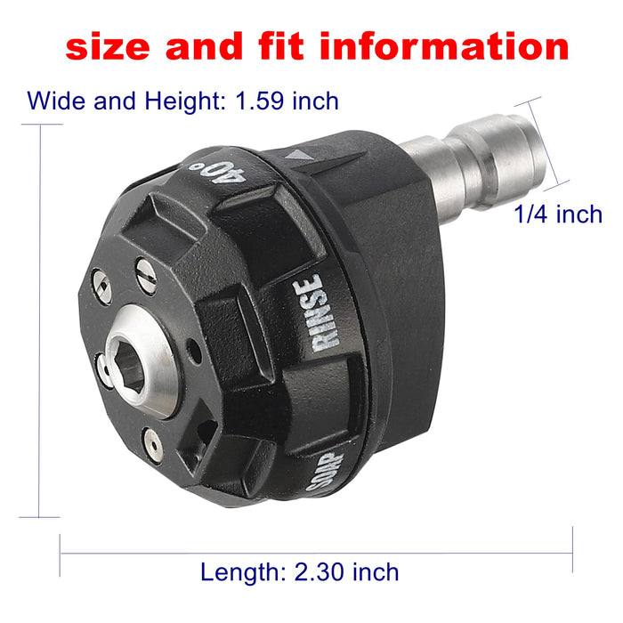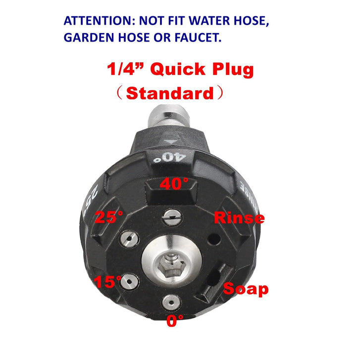 - High Precision Contraption Reduce Weight and Improve Efficiency by Using Smaller, Lighter Aluminum Head, Surprising: Inner Stress Areas Parts are SUS304 Thickened Swivel Valve, Nozzles and Brass Base. The Inlet is 1/4in Plug, Easy Attach to Most brands wand with 1/4in Quick Connector. ☆Note☆ :Can't Attach to Any Water Hose, Pressure Washer Hose or Garden Hose Directly