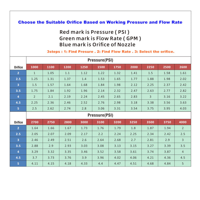 - This 6-in-1 nozzle Provides 6 Different Fast-Switching Patterns Include Standard 0 , 15 , 25 , 40 Degree nozzles, Soap and Rinse nozzles,Rinse is Great for Watering in Garden, Distance Scour Of Unstable Dirty in Hard to Reach Area. ATTENTION: Please check Image 6 and find the suitable orifice based on working pressure and flow rate (GPM). The orifice of this nozzle is 3.0