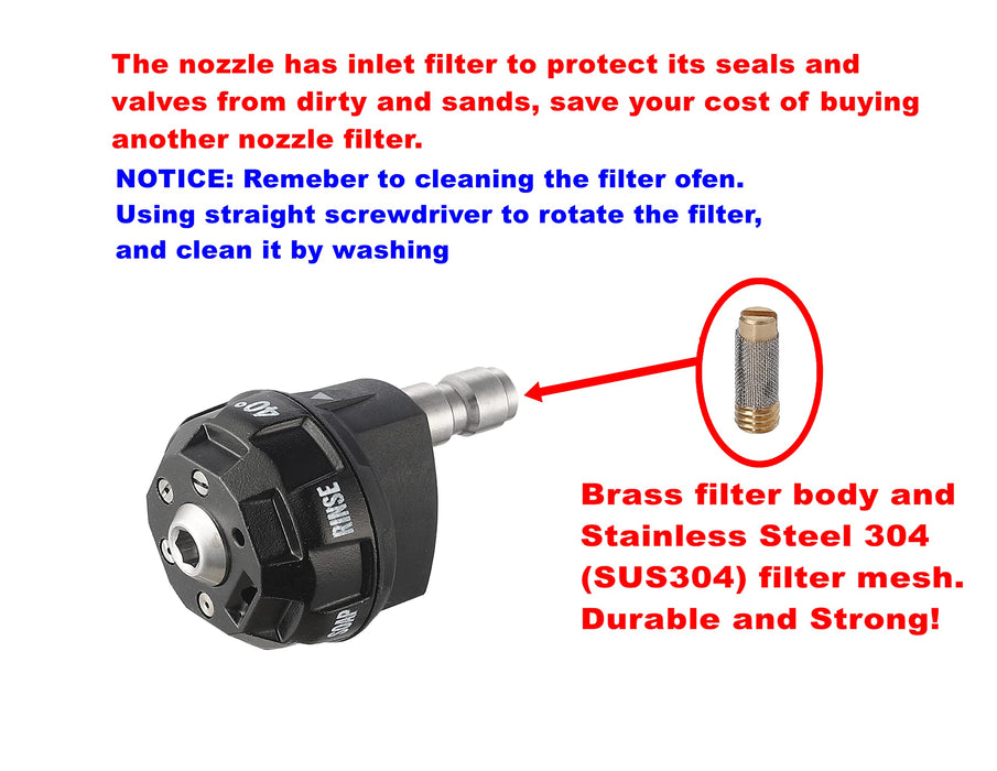 - ★Upgrade Feature:The inlet plug has a REMOVABLE filter to protect its seals and valves from dirty and sands, save your cost of buying another nozzle filter. Brass filter body and Stainless steel (SUS304) filter mesh, extremely durable and strong!