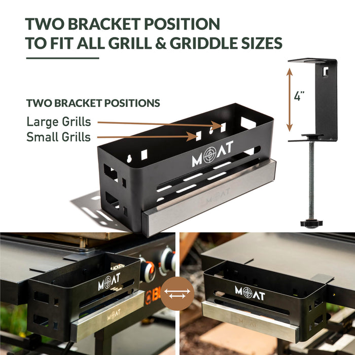 - Designed to Fit More Surfaces: This griddle tools caddy has two positions for the clamps, so it'll fit on small and large side tables; Also, the clamps have a wider 4" opening that'll securely fit around thick surfaces like the ones on many Weber grills
