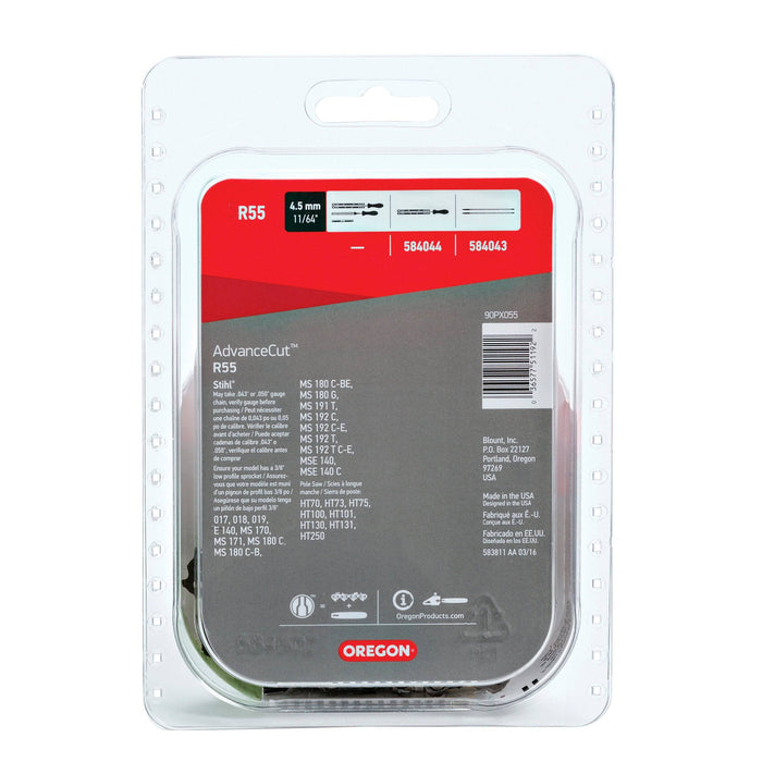 Details: The Oregon R55 AdvanceCut Saw Chain is an ideal choice for landscapers and homeowners who use small, low powered saws to cut trees and limbs to maintain their properties. AdvanceCut saw chain is durable, easy to maintain and has a forgiving cutting performance. The low vibration design gives you greater control, minimizes fatigue and reduces kickback. The .043" gauge narrow kerf cutting systems increase efficiency since they need less power from the saw than standard cutting systems. This 14", 3/8" pitch chain fits several Stihl saws including 017, 019, MS 170, 018 and MS 191T.