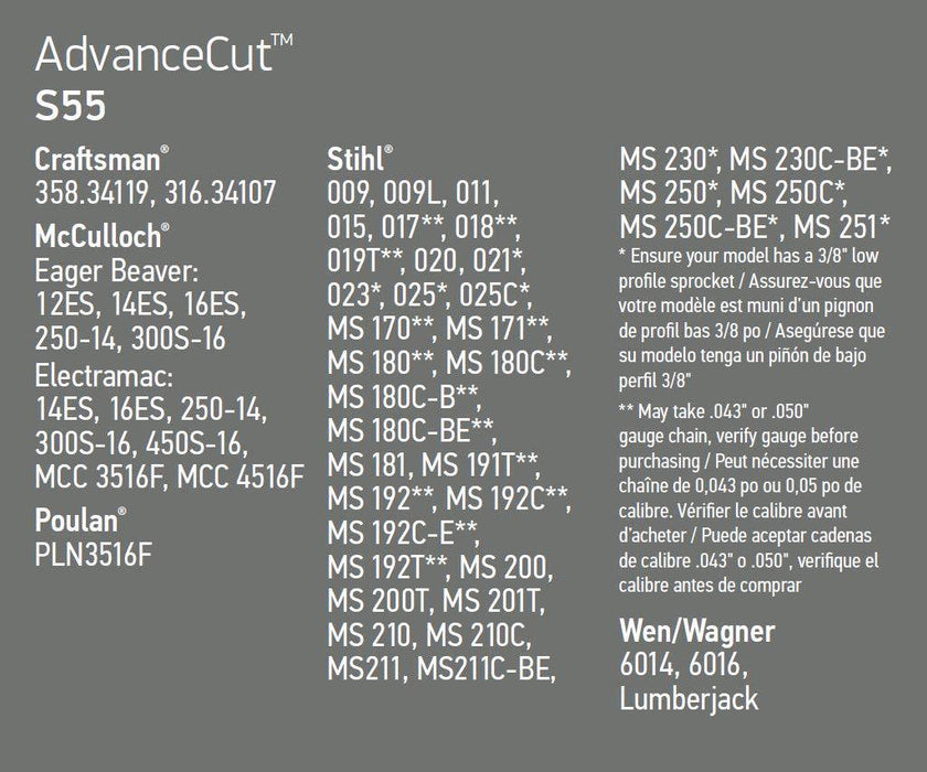Details: Oregon 91PX chain is for homeowners and occasional users who want a low-vibration and low-kickback saw chain. The Chamfer Chisel cutters' twin cutting corners offer outstanding performance. These cutters are durable, easy to maintain and forgiving. Please contact Oregon customer care to ensure the best fit for your chainsaw. Fits many chainsaw models, not all of which are listed here: Craftsman/Sears: 358.34119, 316.34107. Wen/Wagner: 6014, 6019, Lumberjack. McCulloch: Eager Beaver 12ES, 14ES, 16ES, 250-14, 300S-16, 450S-16, MCC3516F, MCC4516F. Poulan: PLN3516F. Stihl: 009, 009L, 011, 015, 017**, 018**, 019T**, 020, 021*, 023*, 025*, 025C*, MS170**, MS171**, MS180**, MS180C**, MS-180C-B**, MS181, MS191T**, MS192**, MS192C**, MS192C-E**, MS192T**, MS200, MS200T, MS201T, MS210, MS210C, MS211, MS211C-BE, MS230*, MS230C-BE*, MS250*, MS250C*, MS250C-BE*, MS251* (*Ensure your model has a 3/8” low profile sprocket) (**May take .043” or .050” gauge chain, verify gauge before purchasing. )