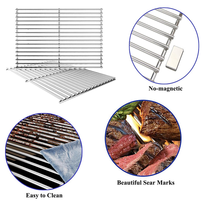 - 【Material】The grill grates replacement parts are made of thicker high-quality stainless steel. 7mm heavy duty solid stainless steel grates are resist corrosion and heat resistance. More durable and safety, no need to replace your cooking grid grate again and again.