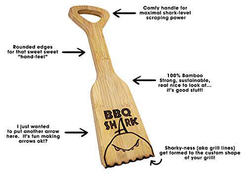 Details: From now on you’ll be keeping the metal out of your insides from using those dumbfangled wire brush death traps, and instead you’ll be blasting METAL from your stereo ---where it belongs! Add BBQ shark to your cart now. - SAFE AND EFFECTIVE BRISTLE FREE GRILL CLEANING keeping your family safe from evil metal bristles that you get with your average BBQ Brush. - 100% BAMBOO WOOD, the best, most eco-friendly wood on earth, and more durable than any other wood like cedar or maple. Won’t break on you! - AWESOME GIFT BOX INCLUDED with useful (and hilarious) instructions. No more wondering what to get Dad as a present. BBQ Shark is a PREMIUM BBQ scraper that he will LOVE! (and he’ll love you more as a result. #PleaseLoveMeDad) - GROOVES WILL FORM TO THE UNIQUE SHAPE OF YOUR GRILL or griddle, making it the perfect scraper for your BBQ and overall grilling experience. - THE MORE YOU USE IT, THE SHARKIER IT GETS! Bonus use: scare away intruders by hanging it on your front door when not in use. They’ll think your house is guarded by a Shark! BBQ Shark is packaged in an AWESOME GIFT BOX with detailed instructions on proper use. How about that?! Makes the perfect gift for hard-to-shop-for men (and women!) too!