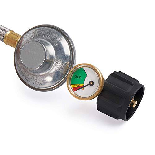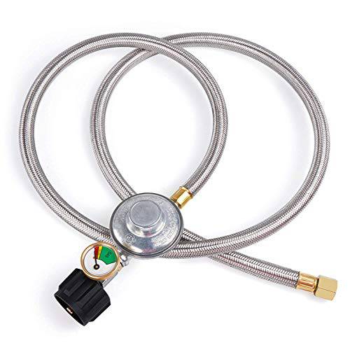 Details: This is upgraded 5ft gas grill regulator hose with propane tank gauge. Do not need to buy extra gas meter, saving your money. 1. Please check to see if the propane tank has the standard propane valve fitting QCC1/Type1, like a Propane Smoker, Gas Grill, Heater, Fire Pit and Generator. Then see device if the other end is a 3/8inch Male Flare Fitting. 2. The output pressure of the regulator is set to 11 inches water column which equates to approximately. 3. Low pressure means the high pressure in your propane tank will be reduced and regulated to the correct pressure for your burners to work as designed. 4. Great for BBQ, camping, tailgating, heating needs or having an outdoor cookout. 5. Our propane regulator with hose has excess flow protection for your safety and will automatically shut off. Attention: 1.Warning!!! For your safety ALL propane appliances like gas grills, heaters and stoves are OUTDOOR Use. 2.FULLY TIGHTENED at both propane tank side and grill side before using on your propane appliances to prevent leakage. 3.To check and make sure the hose is away from the OPEN FIRE before installing to your appliances. 4.Keeping the hose away from HIGH TEMPERATURE. Product Specification: Certificate : CSA Outlet Pressure:11’’W.C. Flow Capacity: 80000 BTU/Hr Length: 5 feet /60 inch(length of rubber hose only) Please double check your appliance connection if is 3/8’’ Male Flare Fitting Connector.