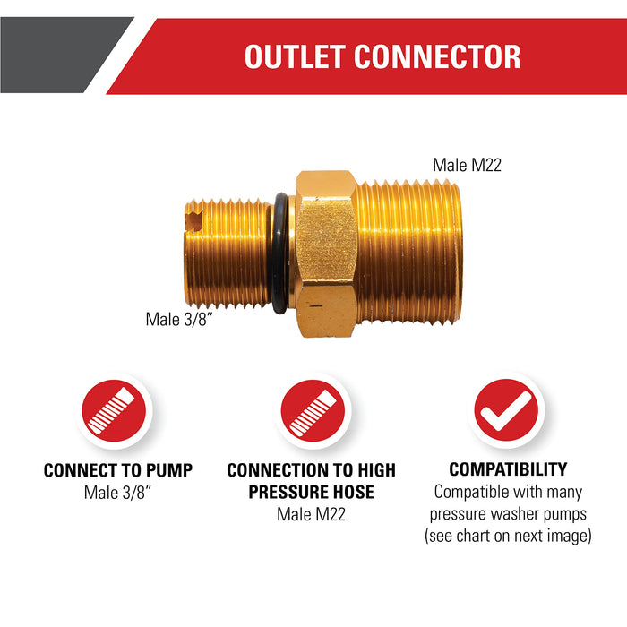 - WHAT IT DOES: This male 3/8-inch to male M22 water outlet adapter allows a female M22 threaded high-pressure hose to connect to a pressure washer pump