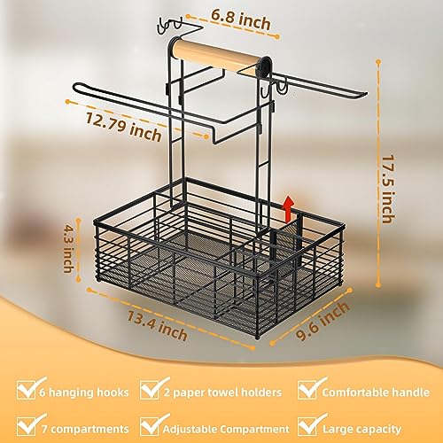 - 【Large Capacity Practical Design】The grill caddy have 7 compartments , with 2 paper towel roll holder and 6 hanging hooks(detachable), features a removable compartment can more easily store outdoor grilling spices, grill accessories , condiments, plates, tableware, spoons, kitchen utensils, paper towel rolls,Keep your BBQ convenient,neat and clean.