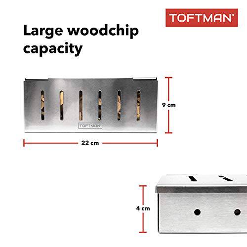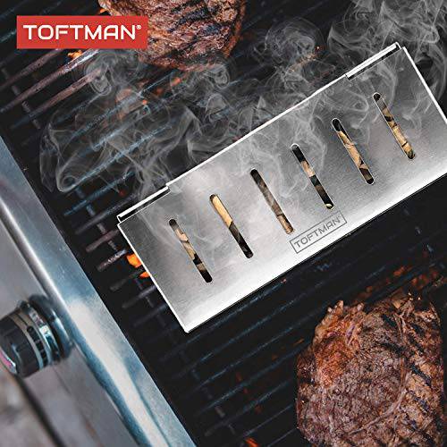 Details: TOFTMAN is a family-owned company based in the USA. We are committed to providing professional-grade utensils and tools that will elevate your home kitchen and grilling setup. With a wide variety of high-quality tools, utensils, and accessories, TOFTMAN is sure to have what you need to take your kitchen to the next level. Turn any charcoal or propane grill into your very own smoker with the TOFTMAN Smoker Box. Avoid the mess and hassle of holding wood chips in foil packets. This durable smoke box is designed to make smoking easy with a flip lid and vents designed to help distribute smoke evenly throughout the grill. It fits easily into most charcoal or gas grills, with dimensions of 42 cm x 1 cm x .20 cm. Simply fill the box with your favorite wood chips for smoking, from mesquite to cherry to hickory, and set it on top of your grill grate. The high-quality 304 stainless steel is restaurant grade, so it won't warp or rust over time. This box is also dishwasher safe, making cleanup a breeze. Bring amazing flavors and complexity to your favorite meats, poultry, and fish. From smoked lobster tails to brisket and turkey, you'll love how a little bit of smoke can transform any meal into something special. This smoker box makes a great gift for aspiring pit masters of any level. Whether you're a BBQ pitmaster, a serious griller, or a home chef, our products will help you perform at your highest level while making it easy to do what you love. Each product is designed for functionality, convenience, durability, and performance. Take your cooking to the next level with TOFTMAN professional-grade tools and accessories.