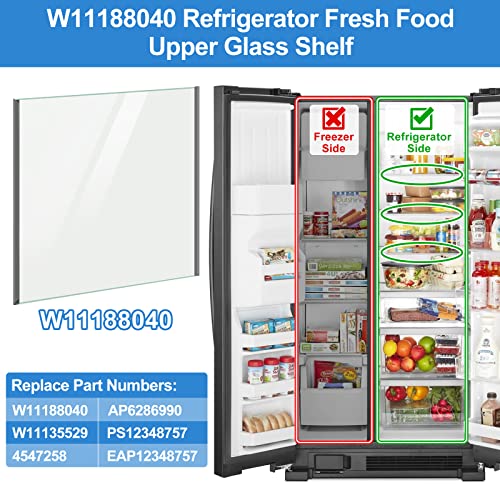 - 【W11188040 Refrigerator Glass Shelf-Upper Glass Shelf】This whirlpool glass shelf replaces Parts Number: W11188040, AP6286990, W11135529, PS12348757, 4547258, EAP12348757. Glass shelf fits the Refrigerator-side of the listed Whirlpool refrigerator Fresh Food Upper Glass Shelf ONLY. Perfect Glass shelf replacement for your cracked W11188040 Glass Shelf,Ultra Durable.