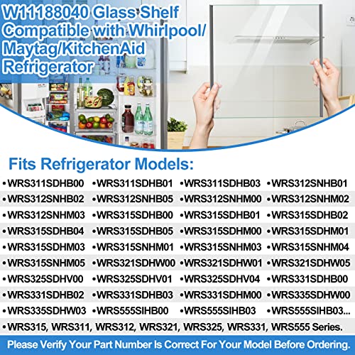 - 【Refrigerator Shelf Glass Replacement Fits Brand & Models】This W11188040 Glass Shelf Compatible with whirlpool KitchenAid Maytag refrigerator glass shelf parts. Fit models: WRS315SDHB00, WRS315SDHB01, WRS315SDHB02, WRS315SDHB04, WRS315SDHB05, WRS315SDHM00, WRS315SDHM02, WRS315SDHM04, WRS315SDHM05, WRS315SDHT00, WRS315SDHM08, WRS321SDHB00, WRS321SDHB01, WRS321SDHB04, WRS321SDHB05, WRS321SDHV00 WRS321SDHV01, WRS321SDHV04, WRS321SDHV05, WRS321SDHW00, WRS325SDHB01, WRS325SDHB04, WRS325SDHV00,WRS555SIHZ00, WRS311SDHB00, WRS311SDHB01, WRS315SDHZ08, WRS315SNHM06, 5GRS315NHM00, MSS25N4MKZ00, WRS315,WRS311,WRS312,WRS321,WRS325,WRS331,WRS335,WRS555...(NOTE: Not all applicable models may be listed.).