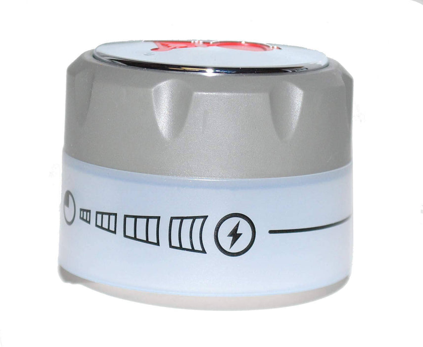- The back half of the knob has a translucent body for emitting light. Features a red Weber Kettle logo on a chrome top, gray finger grip notches and "Off/Ignition/High To Low" graphics which continue approximately halfway around the knob.