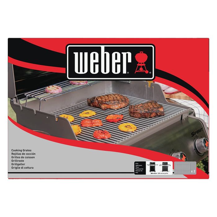 Details: Weber cooking grates are constructed from durable stainless steel to ensure long-lasting use. Stainless steel cooking grates fit spirit 300 series grills. Available in a 2 Pack.