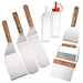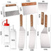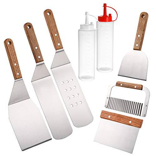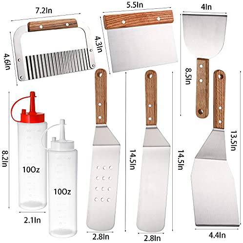 Details: WUWEOT 8 pack griddle cooking set are made from premium stainless steel, comfortable wooden handle for heat insulation,dishwasher safe. Complete griddle set for cooking, griddle grill, bbq, caterers, campersand, restaurant, comes with 2 spatulas, flipper, scraper, chopper, wavy cutting tool, 2 bottles.