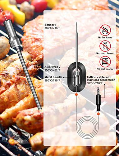 - 2 probes and safety stainless steel: 2 probes are included to monitor different foods at the same time(The wireless thermometer can add max up to 6 probes to use). Wide temperature measurement range: 32℉-572℉. High accuracy ±1℃/±1.8℉. More than 45 inches long and Heat resistant probe wire provides a safe distance to ensure not to burn your hands. Suitable for smoking, grilling, oven and other cooking methods. 304 food grade stainless steel probe, safe and reliable.