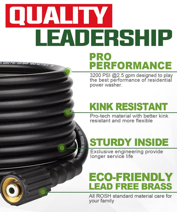- [Kink-free 1/4" Power Washer Hose] New developed material to prevent kink when you wash for extra distance requirement, easy management, and roll-up. TIPS: Please lay flat to full length before using it, then it will be moved and store very easily.