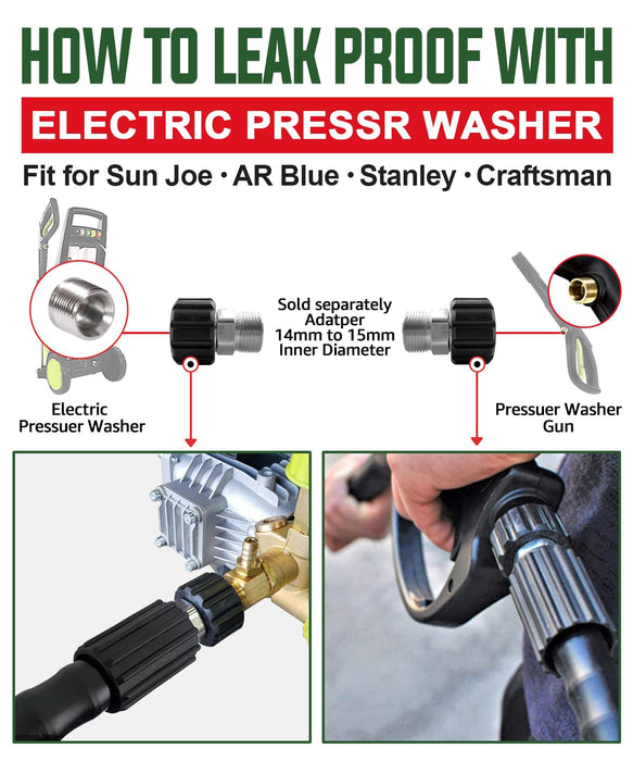 Details: Designed For Gas and Electric Pressure Washers Up To Rated 3200 PSI With American Standard (2)M22-14mm Female Brass Thread Great performance for top brand Honda, Excell, Briggs, Craftsman, Generac, Champion, Simpson, Ryobi, etc. NOTE: *Need 15mm Female to 14mm Male Fitting[ASIN: B07L4NV94B] for Sun Joe, Homdox and AR electric pressure washers and accessories; FEATURES 💦【Kink Resistant】 EASY carry, drag, and roll-up. Nonmarking and Never kink permanently. 💦【Durability】 New upgraded strength and wear resistance for longer lifetime and safe using. 💦【Brass Thread】 Much thicker and smoothly screw, don’t shake or damaged easily and no leaking. SPECIFICATION 🔹 Length: 25' Pressure Washer Hose 1/4" ID 🔹 Max Working Pressure: 3200PSI/ 220BAR 🔹 Burst Pressure: 8700PSI / 600BAR 🔹 Hose Connection: M22X1.5-14mm Female Thread 🔹 Max. Temperature: 15℉-140℉ / 0℃-60℃ NOTE 🚩 Please keep away from the engine muffler, high temperature will damage cover of hose and cause accident. ABOUT YAMATIC Based on almost 20 years of world-class high-end engine design and production experience over global, YAMATIC focuses on providing house tools for family and business. Choose YAMATIC, Choose a better life! 💝【Support】💝 If you have any problems, please feel free to contact us. We will provide all inquiries regarding the product, returns/refunds.